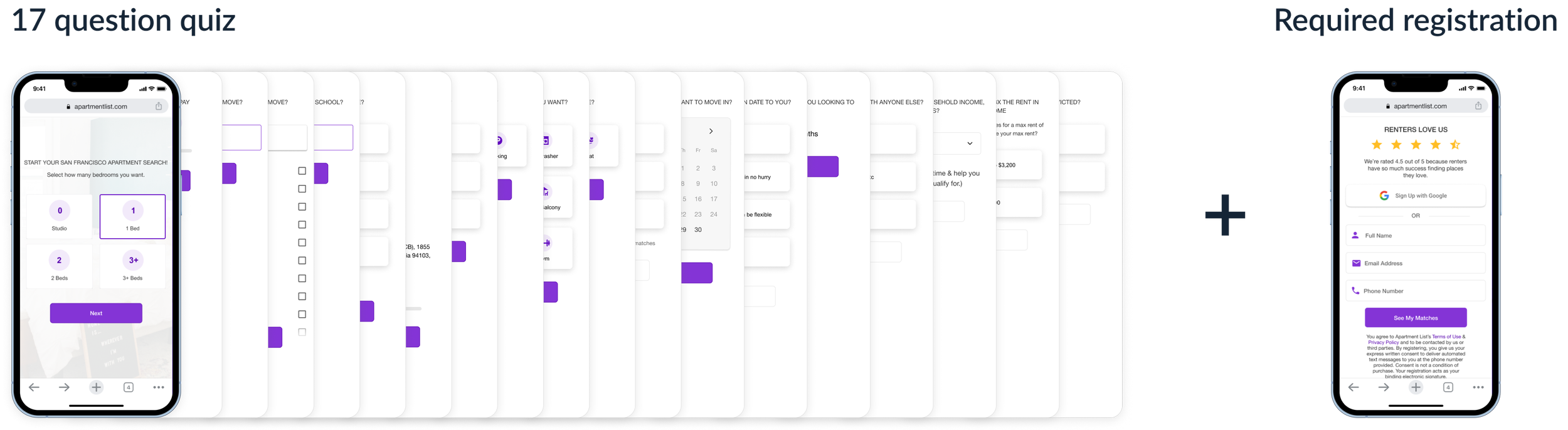 In the current experience, users who land on our site are pushed into a 17 question quiz that asks a series of very detailed questions about their apartment search. After taking the 17 question quiz, the user must register in order to see their results.