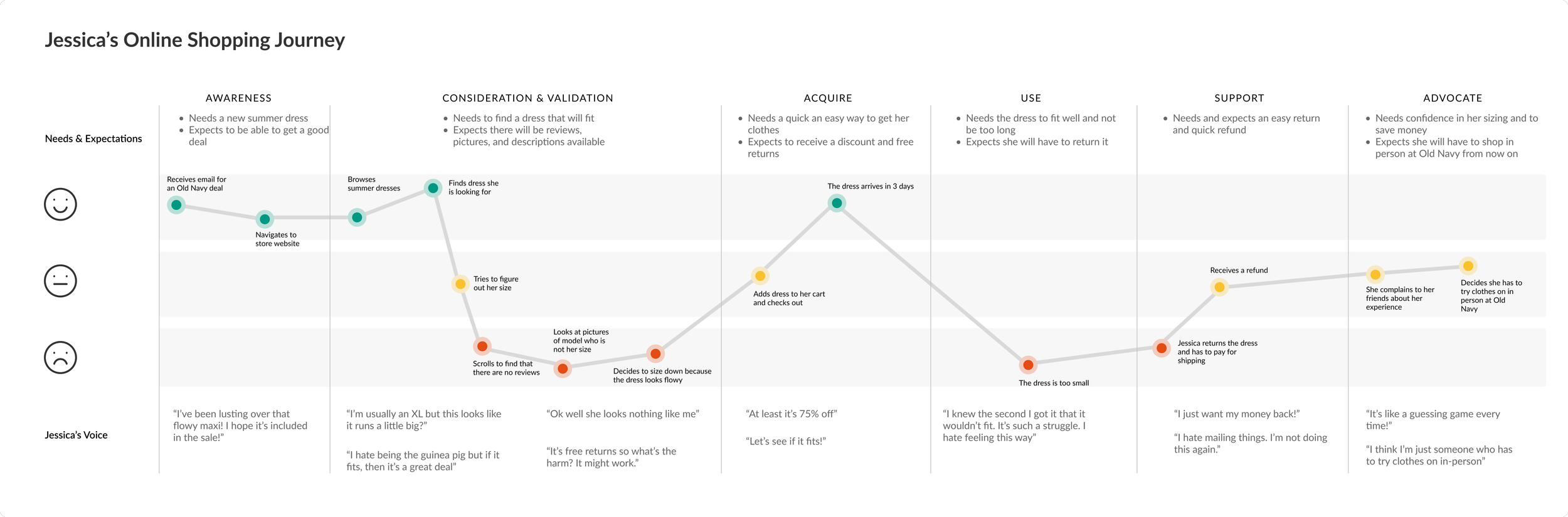 I mapped out Jessica’s journey when online shopping for clothes to understand exactly how she feels when she is shopping and what she is thinking along the way. This helped identify areas that need improvement.