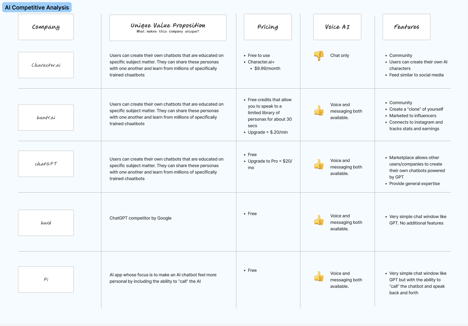 I conducted a wide-ranging analysis of 30 AI products, looking at features, pricing, membership structures, voice capabilities, and unique value props. I synthesized everything into key learnings, standout products, and opportunities we could act on.